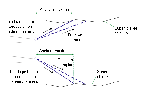Se puede utilizar para modificar el valor fijo de anchura máxima y asociar dicha anchura máxima a un desfase de alineación. Los tipos de objeto siguientes se pueden utilizar como destinos para especificar la anchura: alineaciones, polilíneas, líneas características o representaciones topográficas. |