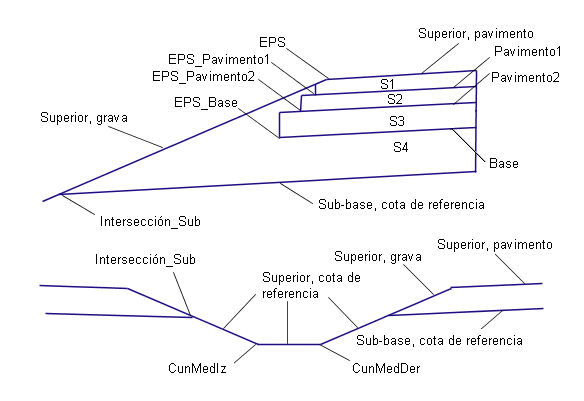Admite el giro de peralte en torno al punto de enlace en el eje o en torno a la elevación del punto de enlace en los bordes interiores de la calzada. La estructura del pavimento en las porciones pavimentadas del arcén sigue las normas descritas en "Estructura del pavimento en las secciones pavimentadas", en la Ayuda de AutoCAD Civil 3D.