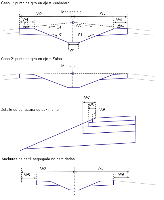 La mediana se puede configurar de manera que el punto de giro se encuentre en el eje o en los bordes interiores de las calzadas. Si se usa el giro de eje, los taludes de peralte de los carriles exteriores izquierdo y derecho se obtienen a partir de las especificaciones de peralte de la línea base, y las elevaciones de los bordes interiores de las calzadas se calculan aplicando estos taludes a las anchuras de la mediana izquierda y derecha desde el punto de enlace. Si no se usa el giro de eje, los bordes de las calzadas se mantienen en la elevación del punto de enlace.