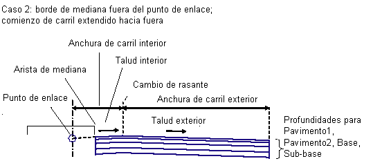 Borde interior de la calzada: la ubicación del borde interior de la calzada se calcula de acuerdo con los tres casos mostrados en el diagrama anterior. Si se indica una alineación de borde de mediana y dicha alineación se encuentra fuera del punto de enlace del carril, el borde interior se desplaza hacia afuera desde el punto de enlace con el talud de carril (caso 2). Si la alineación de borde de mediana se sitúa dentro del punto de enlace del carril, el borde interior se desplaza hacia adentro desde el punto de enlace con el talud de carril interior (caso 3). Si no se indica ninguna alineación de borde de mediana, o bien la que se indica no se encuentra en un P.K., el borde interior se mantiene en el punto de enlace (caso 1).