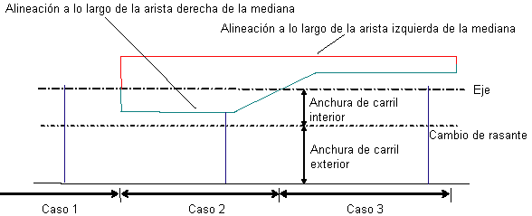 Es posible que la alineación que define el borde de la mediana a veces no esté presente (caso 1), esté fuera del eje de la carretera (caso 2) o se encuentre dentro del eje (caso 3).