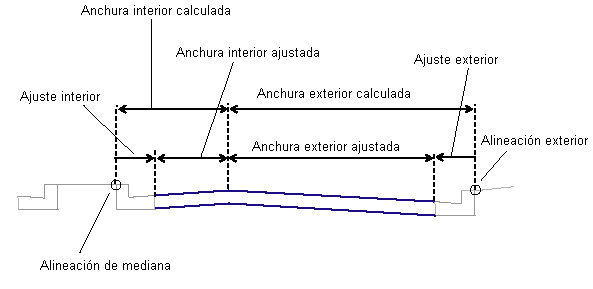 Ajustes interior y exterior: los parámetros Ajuste interior y Ajuste exterior se proporcionan en caso de que las alineaciones utilizadas para los bordes interior o exterior estén situadas en un desfase fijo desde el borde de la calzada real. Por ejemplo, la alineación que se utiliza para el borde de mediana puede estar en la parte posterior del bordillo en lugar de en el borde del pavimento. En este caso el parámetro Ajuste interior se debe establecer en la anchura del bordillo.