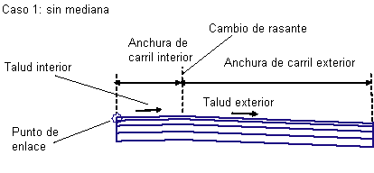 Anchura del carril interior para la condición de ausencia de mediana; es decir, desde el punto de enlace hasta el punto de discontinuidad de pendiente. |
