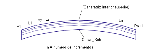 El centro de la línea de cadena se calcula restando la altura de bombeo al punto de enlace, mientras que los bordes derecho e izquierdo de la calzada se calculan aplicando la anchura y el talud simétricamente con respecto al punto de enlace. Las coordenadas de la curva parabólica se calculan a intervalos regulares a lo largo de la línea de cadena y, además, se añaden vínculos de línea recta para conectar los puntos de coordenadas. Para las superficies de pavimento1, pavimento2, base y sub-base se insertan superficies paralelas a partir de las profundidades indicadas.