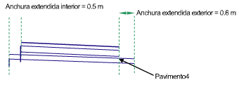 En el siguiente ejemplo, la anchura extendida interior de pavimento4 es de 0.5 metros. La anchura extendida exterior de pavimento4 es 0.6 metros. Si se inserta este subensamblaje en la parte derecha, se dibujará como se muestra en la siguiente ilustración.