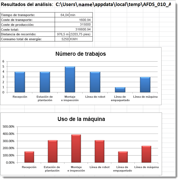 Para los tipos de transporte continuo: suma de la longitud de la línea de conexión * [redondeo (cantidad de piezas del trabajo/tamaño de lote)] de todos los trabajos Para los tipos de transporte no continuo: suma de la longitud de la línea de conexión * [redondeo (cantidad de piezas del trabajo/tamaño de lote)] de todos los trabajos Nota: Si es bidireccional, la distancia se duplicará