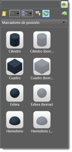 Cuadros sólidos y transparentes, cilindros, esferas y hemisferios se instalan con Factory Design y se almacenan en la carpeta Marcadores de posición de componentes del sistema.