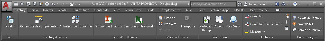 La interfaz de usuario de Factory Design está ubicada en la ficha Factory y se organiza en grupos denominados Herramientas, Componentes de Factory, Sincronizar flujos de trabajo, Flujo de materiales, Nube de puntos, Utilidades y Comunidad. Una combinación de paneles de Factory y AutoCAD estándar crean el entorno de trabajo de Factory por defecto.