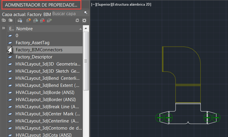 Los conectores BIM de la fábrica también se pueden ver en el Administrador de propiedades de capas, al que se accede introduciendo CAPA en la línea de comando.
