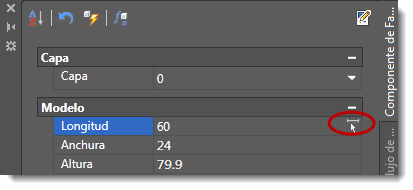 Cuando se actualiza una medida de distancia (por ejemplo, para la altura, la anchura o la longitud), se puede introducir el valor en el campo o hacer clic en el icono de Medida para definir la distancia mediante la selección de dos puntos.