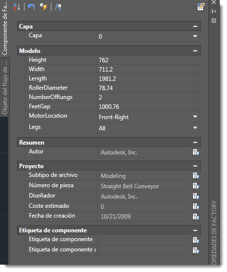 > ficha Componente de Factory. Para acceder al explorador también se puede hacer clic con el botón derecho en el componente y seleccionar Factory > Propiedades de Factory en el menú contextual.