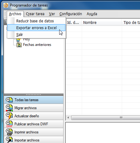 La opción Exportar errores a Excel está disponible en el menú Archivo del programador de tareas y en el menú contextual de la tarea seleccionada.