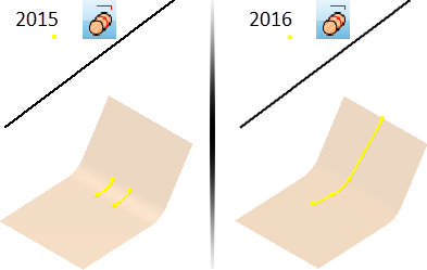Se ha mejorado la opción Ajustar a superficie del comando Proyectar en superficie. Ajustar a superficie es más predecible y ahora puede ajustarse a una amplia variedad de superficies. La siguiente imagen muestra los resultados del ajuste de una línea recta en dos planos y una curva en ambas versiones, 2015 y 2016.