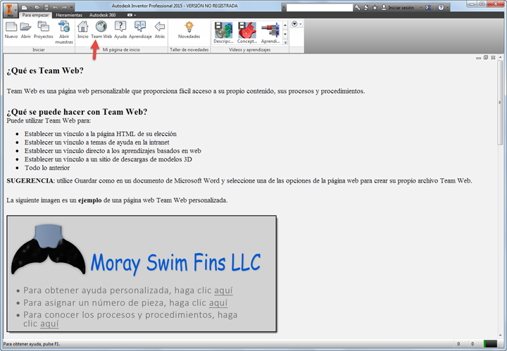 Puede iniciar Team Web desde varias ubicaciones, incluyendo la ficha Para empezar, grupo Mi página de inicio. Una opción de aplicación en la ficha Archivos le permite convertir Team Web en la pantalla de inicio predeterminada de Inventor.