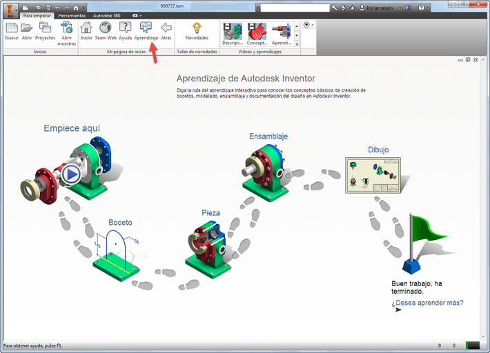 Haga clic en la entrada de aprendizaje de la ficha Para empezar, grupo Mi página de inicio, para acceder a la ruta del aprendizaje. Los aprendizajes proporcionan una ruta guiada para conocer los conceptos básicos de los bocetos, las piezas, los ensamblajes y los dibujos de todo el flujo de trabajo. El rastreo de progresos muestra lo que se ha completado. Las mejoras en la UI del aprendizaje interactivo ofrece una mejor experiencia visual.