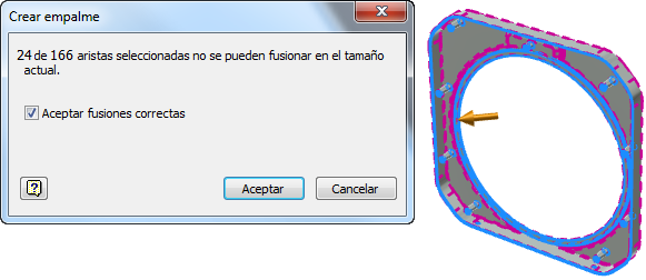 En versiones anteriores, si una arista de un conjunto de selección de empalme generaba un error, fallaba toda la operación de empalme. En esta versión, los fallos de fusión abren un cuadro de diálogo con la opción de empalme de las aristas correctas.