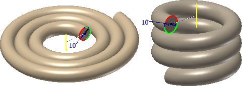 En la siguiente imagen, los perfiles de boceto son círculos. Un círculo crea una cara única y hace que la bobina falle. Para resolver el problema, la geometría de boceto se divide en dos segmentos. Las operaciones de espiral y bobina finalizan correctamente.