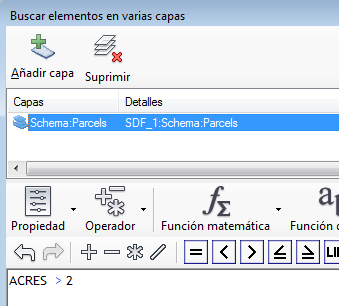 - Para añadir más capas de elemento a los datos que se están buscando mediante la expresión, haga clic en Añadir capa y seleccione la capa que desee añadir. Para eliminar una capa, selecciónela en la lista y haga clic en Suprimir.