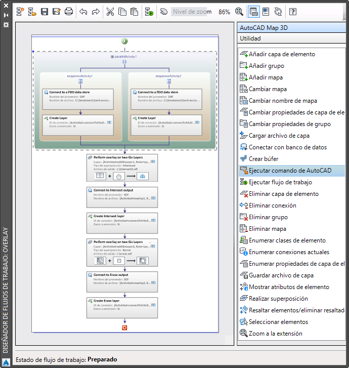 El panel de actividades, en el lado derecho del Diseñador de flujos de trabajo, contiene dos categorías de actividades. Las actividades de AutoCAD Map 3D son específicas de AutoCAD Map 3D (incluyendo una actividad que ejecuta comandos de AutoCAD).