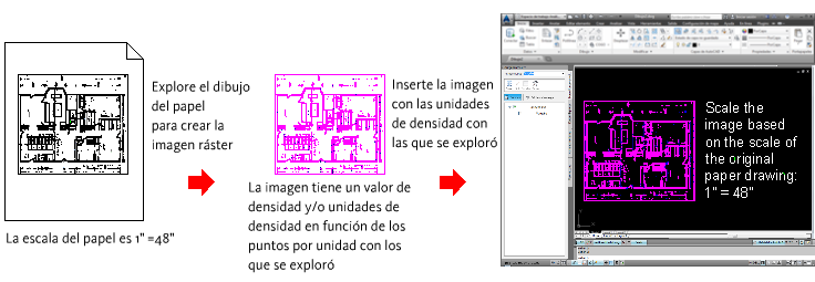 La imagen del siguiente ejemplo se dibujó en una escala papel de 1" = 48", se exploró a 300 puntos por pulgada y, a continuación, se insertó en un dibujo utilizando 300 como valor de densidad y pulgadas como unidades de densidad. Por consiguiente, se escaló en función de su escala papel: 1" = 48".
