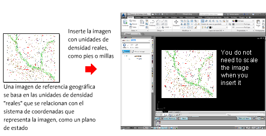 El siguiente ejemplo muestra la relación entre las unidades de densidad y una imagen con referencias geográficas. Dado que no existe una escala papel a considerar, se puede insertar la imagen utilizando las unidades que representa la imagen, como pies o millas, y no es necesario escalar la imagen al insertarla.