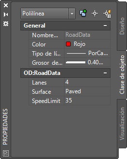Si selecciona un objeto creado mediante la clasificación de objetos, las propiedades asociadas a esa clase de objeto se mostrarán en la ficha Clase de objeto de la paleta Propiedades. Por ejemplo, si selecciona una carretera, la paleta Propiedades mostrará la capa, el grosor de línea, el tipo de superficie y el número de carriles. Edite propiedades introduciendo nuevos valores en la ventana.