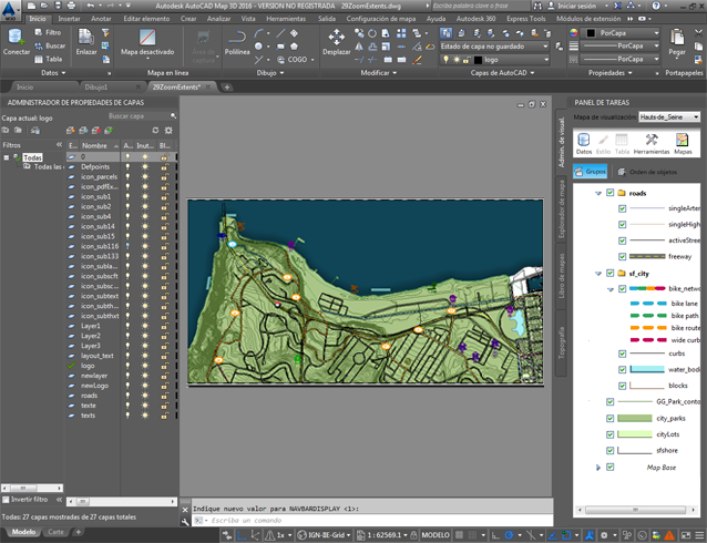 Este mapa contiene capas de AutoCAD (a la izquierda) y las capas del Administrador de visualización (a la derecha).