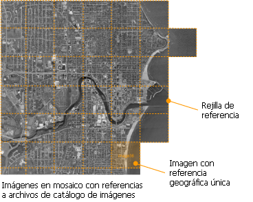 Los archivos ráster (o de imagen) son datos basados en píxeles, como las fotografías digitales, que se pueden utilizar como fondos para los datos de elemento y dibujo. Por ejemplo, puede mostrar una fotografía aérea de una ciudad bajo una capa de calles. Los archivos ráster se catalogan para optimizar el rendimiento. Como parte del proceso de carga, se crea un catálogo ráster.