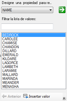 - Para filtrar la lista, en Filtrar la lista de valores introduzca los caracteres que actuarán como filtro. Por ejemplo, introduzca ill para encontrar Dillard y Fillmore. Haga clic en la flecha verde. La lista muestra todos los valores que contienen dichos caracteres.