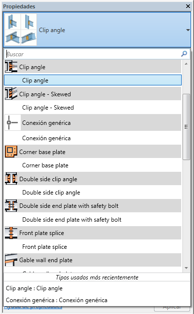 Si se selecciona Conexión genérica, el Selector de tipo se rellena con todas las conexiones estructurales recomendadas para esa situación.
