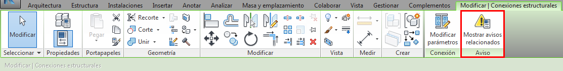 Cuando no se puede crear una conexión, puede visualizar los correspondientes avisos haciendo clic en el botón Mostrar avisos relacionados en la ficha contextual de la conexión seleccionada: