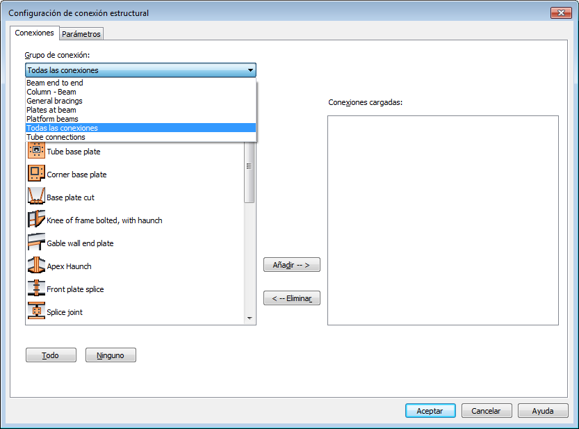 En el cuadro de diálogo Configuración de conexión estructural, en la ficha Conexiones, puede cargar o descargar tipos de conexión del proyecto mediante los botones Añadir o Eliminar. Los tipos de conexión disponibles se muestran en la ventana izquierda; por su parte, los que se cargan en el proyecto aparecen en la ventana de la derecha.