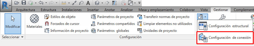Las plantillas de Revit no incluyen tipos de conexión estructural precargados. Para cargar diferentes tipos de conexión en el proyecto, debe instalar los complementos y acceder al cuadro de diálogo Configuración de conexión estructural, ubicado en la ficha Gestionar > grupo Configuración > Configuración estructural > Configuración de conexión: