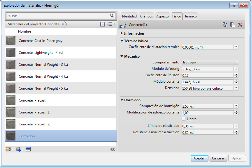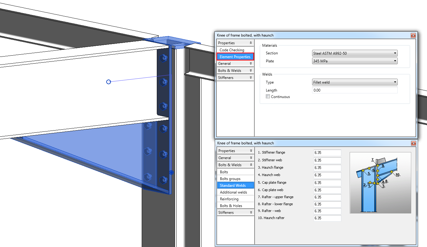 En la ficha Element Properties, puede especificar los materiales de los objetos creados por la conexión: pletinas, cartelas, vigas, contrafuertes, almas, etc. Los materiales disponibles en los cuadros combinados son los que se han cargado en el proyecto de Revit. El motor de comprobación de código realizará todas las verificaciones con los valores de Objetos físicos de un determinado material, presente en la biblioteca de Revit.