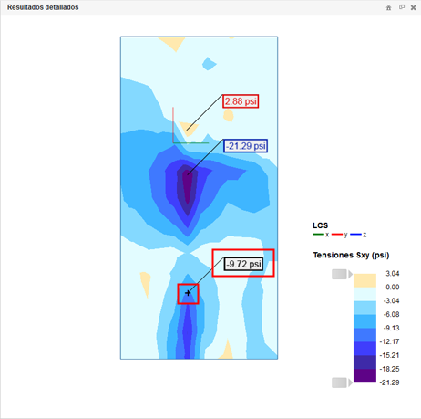 para abrir la vista Resultados detallados. Se muestra una vista del elemento seleccionado en el modelo y los valores extremos de los resultados seleccionados para dicho elemento, mapas para elementos superficiales y diagramas para armaduras.