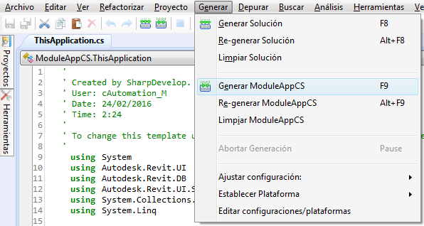6. En el IDE de macros de Revit, seleccione la opción específica de la macro en la lista desplegable Construir.
