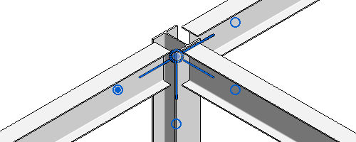 Algunas conexiones requieren un medio de identificación del elemento primario en una unión para crear correctamente la geometría. En la imagen anterior, la viga de la izquierda es el elemento primario. Un elemento primario se asigna haciendo clic en el control de círculo correspondiente en el área de dibujo. En la imagen siguiente, el elemento primario es el pilar.