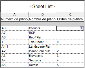 La lista de planos muestra una columna denominada Orden de planos. Posteriormente, ocultará esta columna para que no aparezca en la lista de planos. Pero primero debe asignar un orden de secuencia a cada plano incluido en la lista.