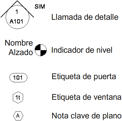 La leyenda de símbolos ilustrada a continuación identifica los símbolos de anotación utilizados en un conjunto de documentos de construcción.