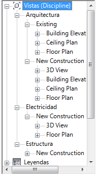 Por ejemplo, en la imagen siguiente se muestran las vistas del Navegador de proyectos ordenadas por disciplina, y luego por fase y por tipo de vista. El nivel superior de la rama Vistas también muestra el nombre del grupo de clasificación aplicado (en este caso, Disciplina).