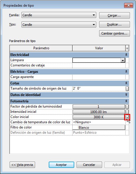 Al vincular estos parámetros y añadir una lámpara de araña a un modelo de construcción, en el proyecto puede ajustar el parámetro Intensidad inicial (u otros parámetros vinculados) para toda la lámpara de araña. No es posible cambiar la Intensidad inicial de cada vela de la lámpara de araña.
