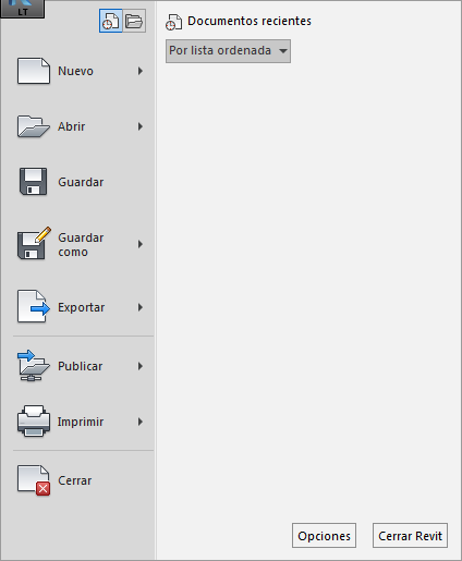 En el menú de la aplicación, haga clic en el botón Documentos recientes para ver una lista de los archivos abiertos recientemente. Utilice la lista desplegable para cambiar el orden de clasificación de los documentos recientes. Utilice las chinchetas para mantener documentos en la lista, independientemente de si se han abierto recientemente.