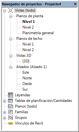 El Navegador de proyectos muestra una jerarquía lógica de todas las vistas, tablas de planificación, planos, grupos y otras partes del proyecto actual. Al expandir o contraer una rama, aparecen o se ocultan los elementos de niveles inferiores.