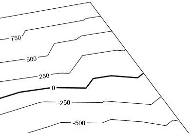 Las etiquetas aparecen en las curvas de nivel. Puede que sea preciso aplicar zoom para ver las etiquetas. La línea de la etiqueta no se puede ver hasta que se selecciona una etiqueta.