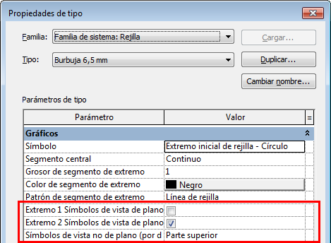 Es posible especificarlo gráficamente para una línea de rejilla individual en una vista o para todas la líneas de rejilla de un tipo concreto, cambiando las propiedades de tipo.