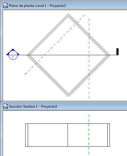 Por ejemplo, el plano de planta mostrado a continuación muestra dos planos de referencia representados como líneas verdes discontinuas. El plano de referencia de la izquierda interseca la línea de sección en ángulo. El plano de referencia de la derecha es perpendicular a la línea de sección. Dado que el plano de referencia en ángulo no es perpendicular a la línea de sección, el plano no es visible en la vista en sección resultante. Pero el plano de referencia perpendicular sí se muestra en dicha vista.