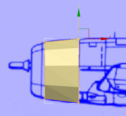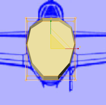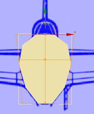 - Effectuez cette opération dans la fenêtre Perspective, mais observez votre travail dans la fenêtre Face : faites glisser le curseur vers le haut pour extruder le polygone sélectionné jusqu'à l'avant de l'avion.
