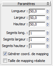 panneau déroulant Paramètres, affectez la valeur 50,0 aux paramètres de longueur, de largeur et de hauteur.
