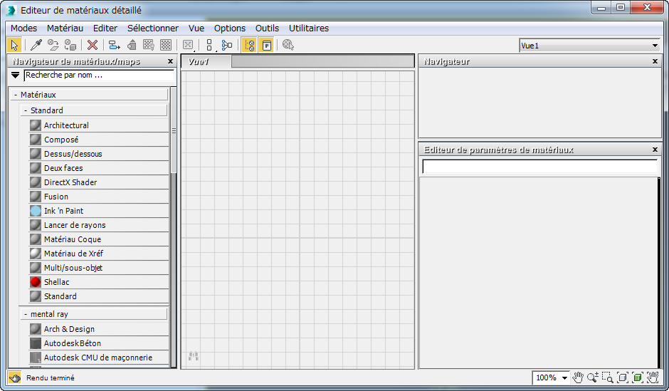 Editeur de matériaux détaillé dans la barre de menus de l'éditeur de matériaux. L'éditeur de matériaux compact comporte une petite fenêtre avec des champs échantillon facilement repérables dans la partie supérieure de l'interface.