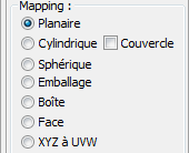 Un certain nombre de commandes du modificateur Développer UVW vous aident à associer des types d'objets spécifiques. Certaines de ces options sont identiques à celles du modificateur Mapping UVW. Par exemple, le bouton